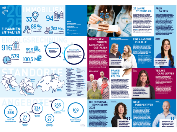 Zusammen entfalten – der Geschäftsbericht als PosterDer Geschäftsbericht 2025 erscheint erstmals auch in neuer Form: als gefaltetes A2-Poster, das Zahlen, Menschen und Projekte sichtbar macht. Die eine Seite zeigt die Hard Facts: Zahlen, Standorte, Angebote und Finanzierung. Die andere Seite bringt die Soft Facts: Einblicke in Projekte, Stimmen aus den Institutionen und die Themen, die uns prägen – von der zkj Akademie über das Projekt Kompass bis zur Politischen Steuergruppe. Je nach Interesse lässt sich die gewünschte Seite sichtbar machen und aufhängen. Das Poster kann per E-Mail an kommunikation@zkj.ch bestellt werden. |